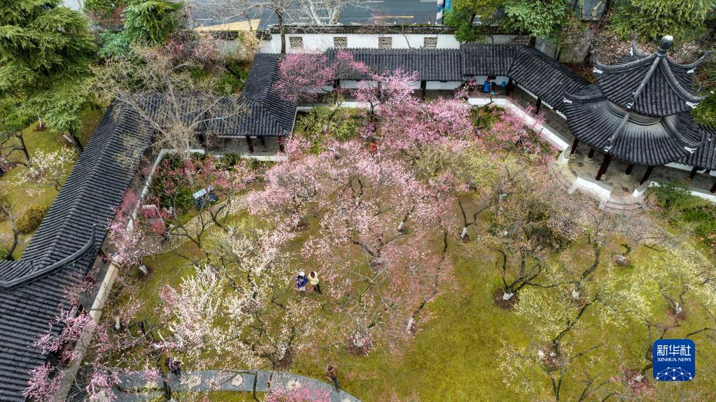 2月10日,游人在南京雨花臺風(fēng)景區觀(guān)賞梅花(無(wú)人機照片)。