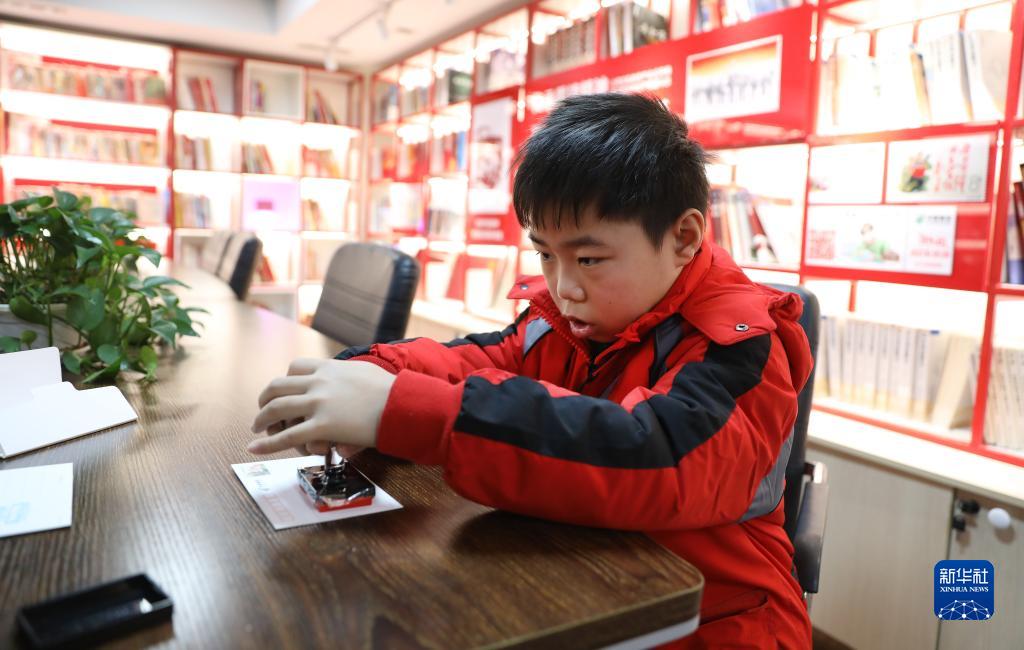 2月10日,一個(gè)小朋友在雷鋒紀念館內的雷鋒郵局里為主題明信片蓋上紀念戳。