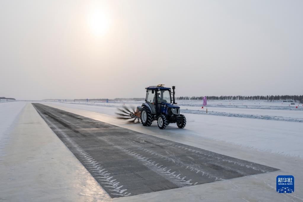 2月10日,在黑河小烏斯力測試基地,掃雪車(chē)清掃冰面上的積雪。