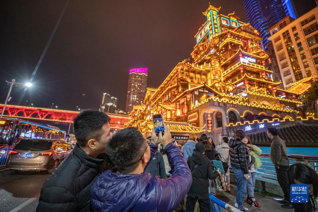 2月10日晚,游客在位于重慶市渝中區的洪崖洞街區游覽拍照。