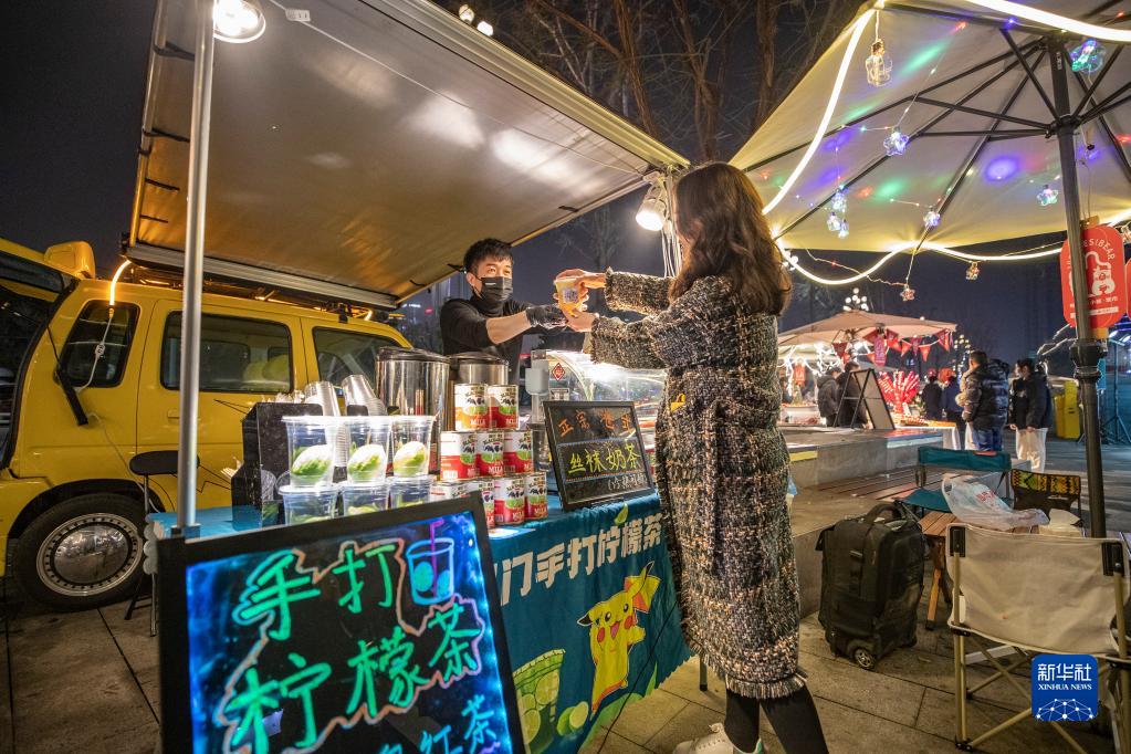 2月9日晚,在位于重慶市南岸區南濱路旁的小熊集市,來(lái)自澳門(mén)的攤主鐘嘉明將制作好的特色飲品遞給消費者。