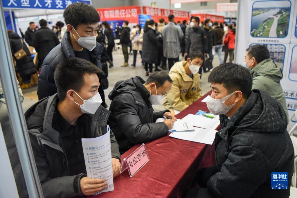 2月11日,在新疆國際會(huì )展中心舉行的2023新疆春季人才交流會(huì )上,招聘人員與求職者(左)交流崗位信息。