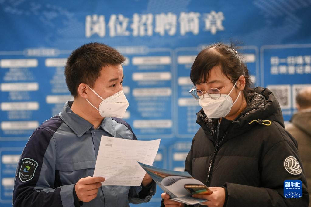 2月11日,在新疆國際會(huì )展中心舉行的2023新疆春季人才交流會(huì )上,招聘人員與求職者(右)交流崗位信息。