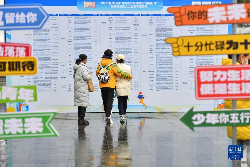 2月11日,在長(cháng)沙市天心區黃興南路步行街,求職者在招聘活動(dòng)現場(chǎng)查看崗位信息。