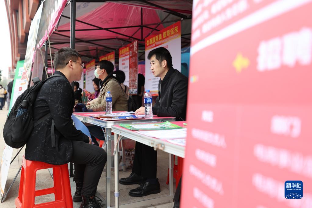 2月11日,招聘人員與求職者(左)在廈門(mén)市集美區春風(fēng)行動(dòng)暨就業(yè)援助月招聘會(huì )上交流崗位信息。