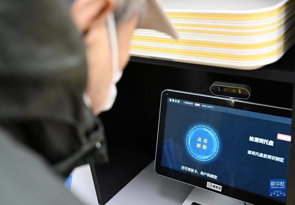 一名老人在天津市和平區南營(yíng)門(mén)街道的老年人“智慧食堂”通過(guò)面部識別系統領(lǐng)取餐盤(pán)(2月10日攝)。