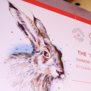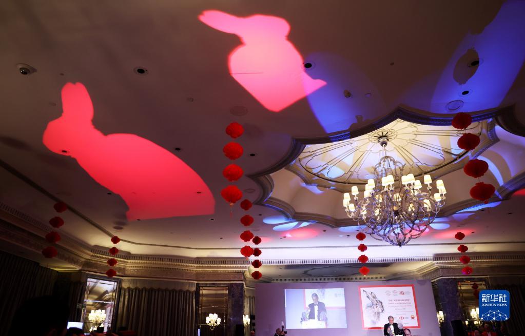 2月8日,在英國倫敦,兔子的造型投影在“破冰者”2023新春慶?;顒?dòng)現場(chǎng)的天花板上。
