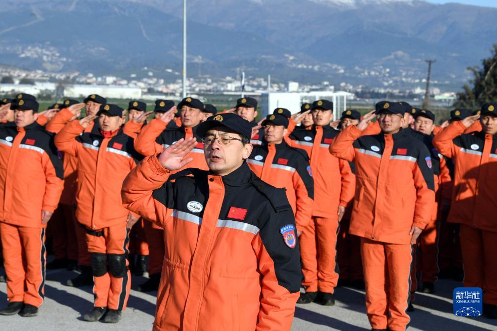 2月10日,中國救援隊隊員在土耳其哈塔伊省安塔基亞市的駐扎營(yíng)區參加升旗儀式。