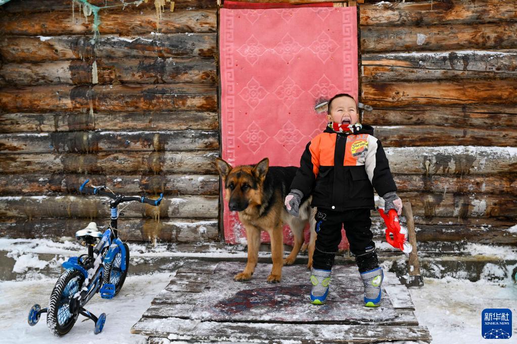新疆阿勒泰地區禾木村的小朋友其力格爾在小木屋前玩耍(2023年1月11日攝)。新華社記者 胡虎虎 攝