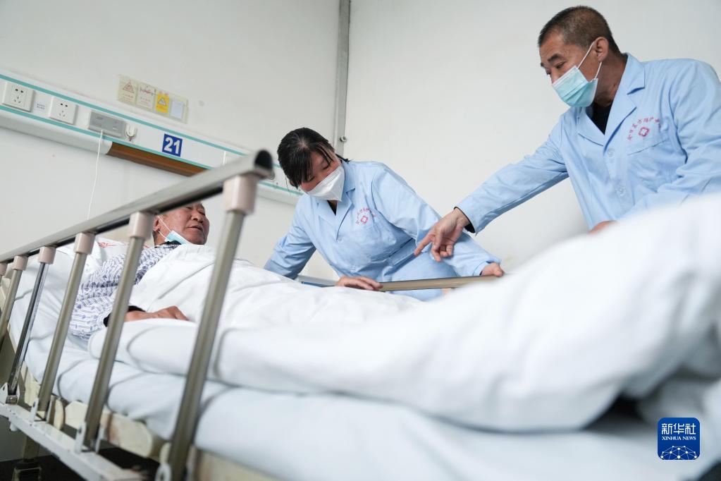 在北京市房山區良鄉醫院神經(jīng)內科三病區,北京今日東方家政公司的一位老護工(右)幫助新上崗的薛四四(中)一起為患者整理床鋪(2月10日攝)。