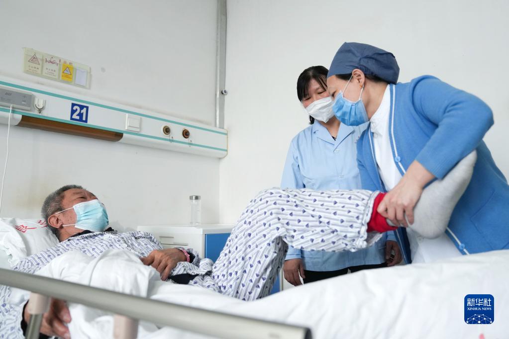 在北京市房山區良鄉醫院神經(jīng)內科三病區,一位護士(右)為新上崗的薛四四(中)講解科內病人護理的一些知識(2月10日攝)。