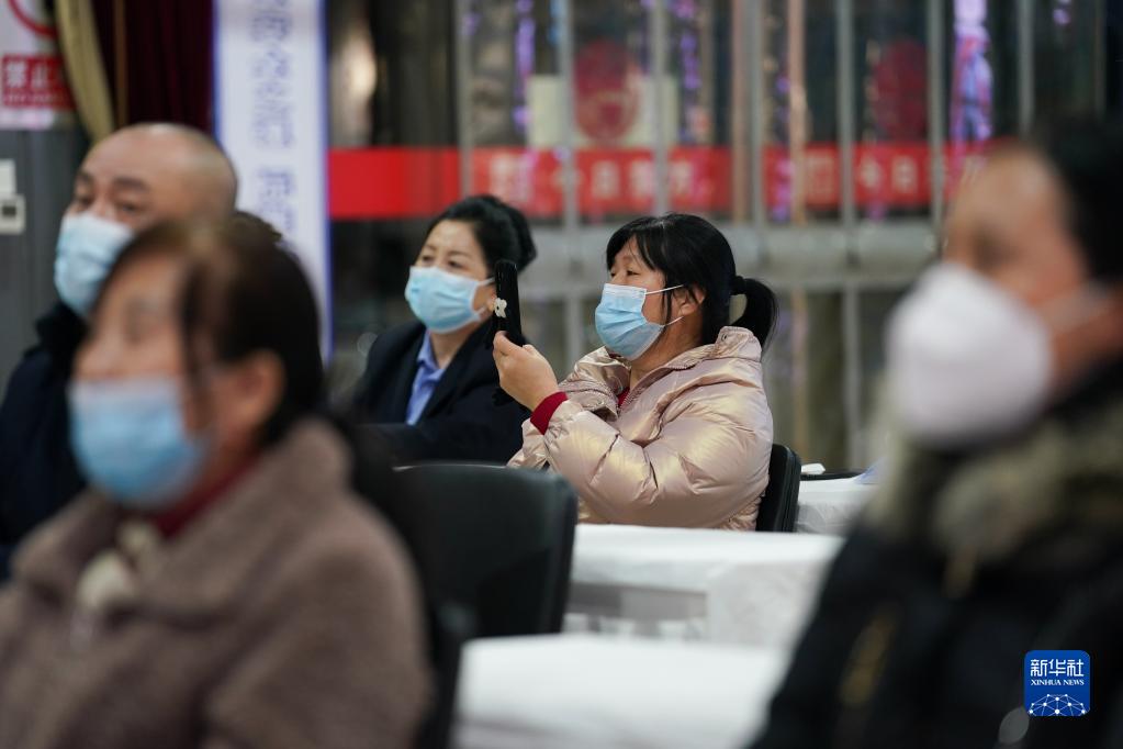 薛四四(右二)在北京市今日東方家政服務(wù)公司組織的歡迎儀式上拍攝記錄(2月4日攝)。