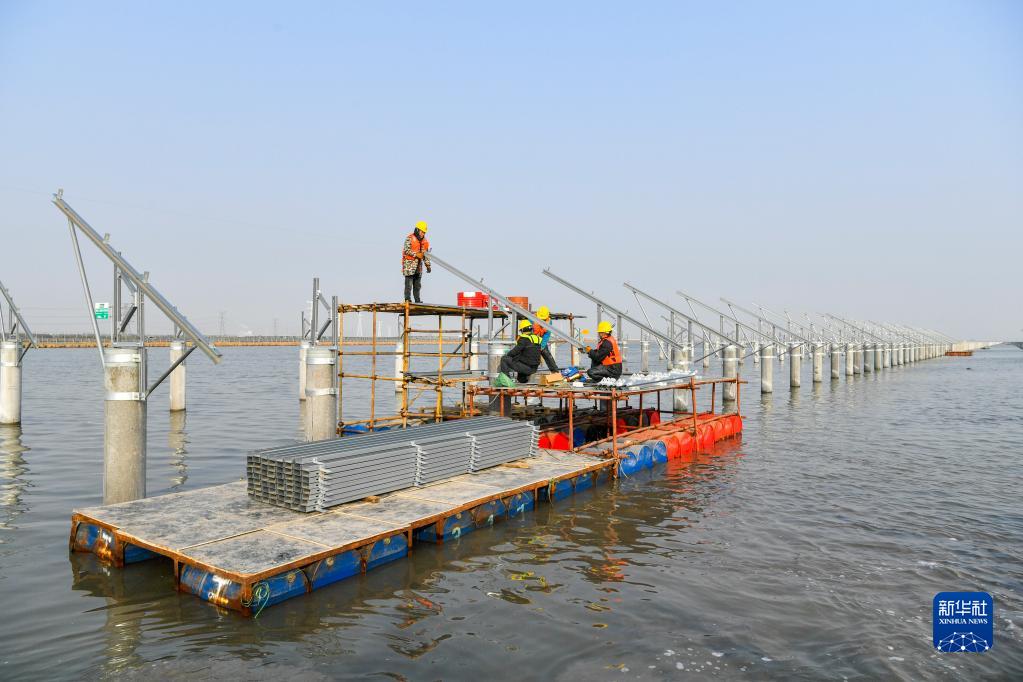 在天津濱海新區龍源海晶鹽光互補項目建設現場(chǎng),建設者在水面上安裝光伏板結構組件(2月7日攝)。
