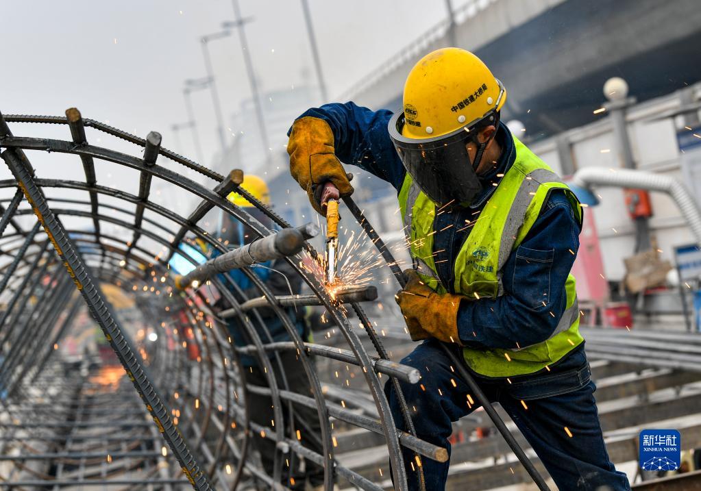 在天津地鐵8號線(xiàn)一期工程5標項目南珠橋站施工現場(chǎng),建設者進(jìn)行焊接作業(yè)(2月11日攝)。