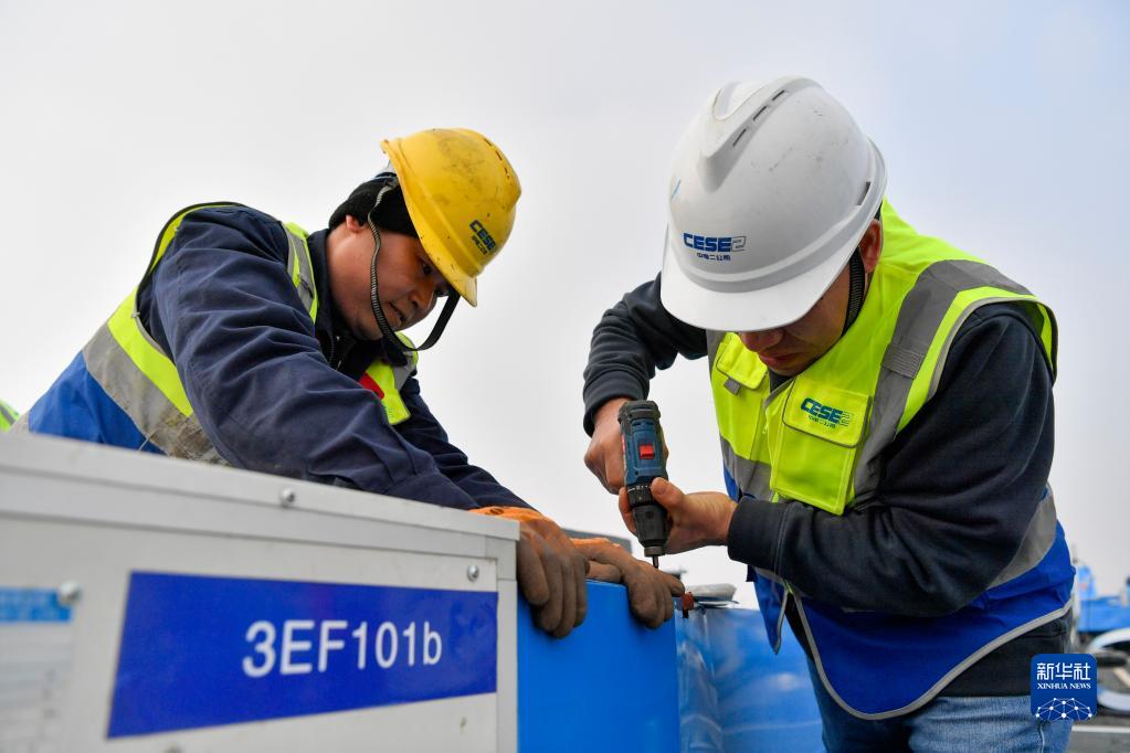 在天津“細胞谷”項目建設現場(chǎng),建設者在屋頂安裝外部通風(fēng)管保溫材料(2月10日攝)。