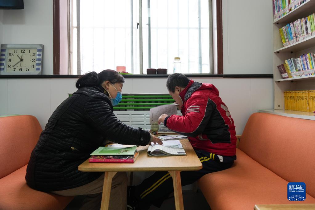 2月12日,在山東鄒城市鋼山街道龍山社區如康家園內,殘疾人(右)在工作人員陪護下閱讀書(shū)籍。