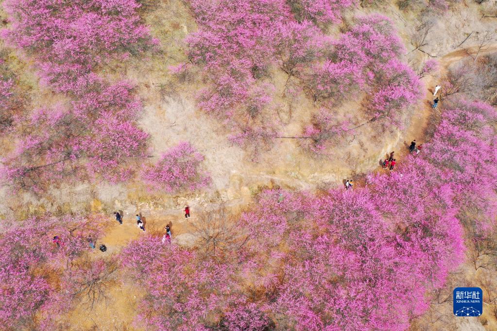 2月12日,游客在浙江省寧波市奉化區溪口鎮“梅花谷”游覽(無(wú)人機照片)。