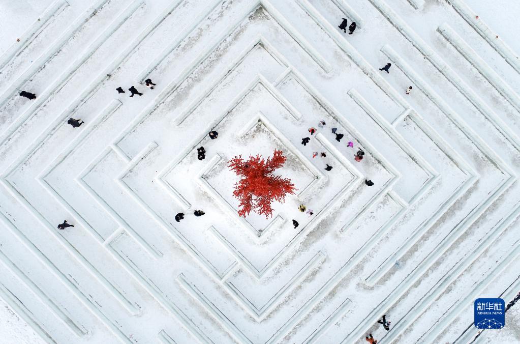 2月12日,游客在呼和浩特冰雪節冰雪景區感受冰雪迷宮樂(lè )趣(無(wú)人機照片)。