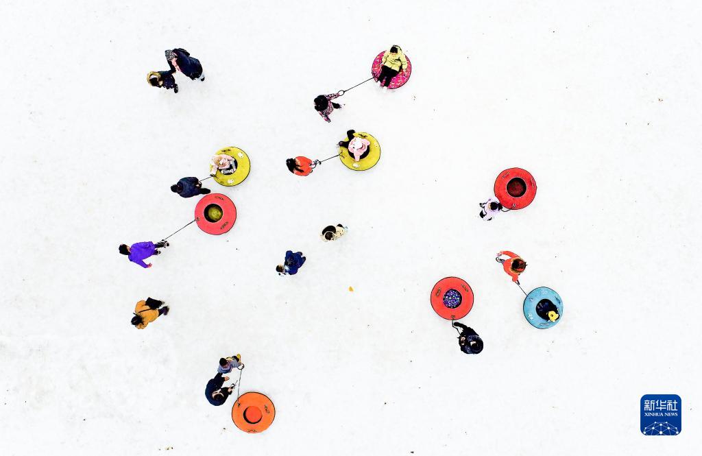 2月12日,游客在呼和浩特冰雪節冰雪景區體驗雪圈(無(wú)人機照片)。
