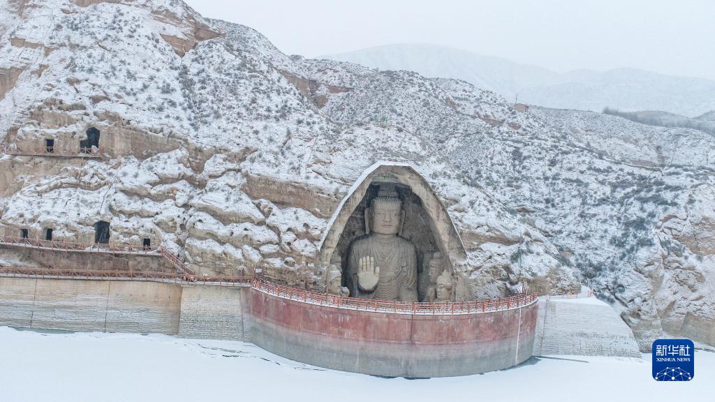 當日,位于甘肅省武威市涼州區的天梯山石窟迎來(lái)一場(chǎng)降雪。在皚皚白雪映襯下,窟區造像與原野山川構成一幅寧謐而優(yōu)美的畫(huà)卷。