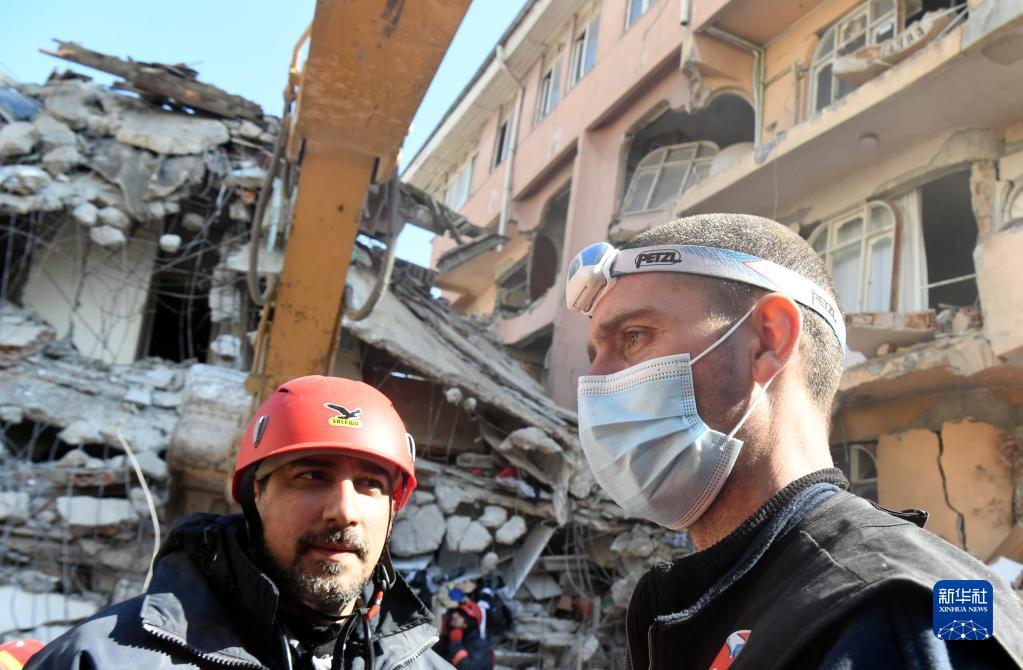 2月12日,救援人員在土耳其哈塔伊省安塔基亞市一處地震廢墟開(kāi)展救援工作。