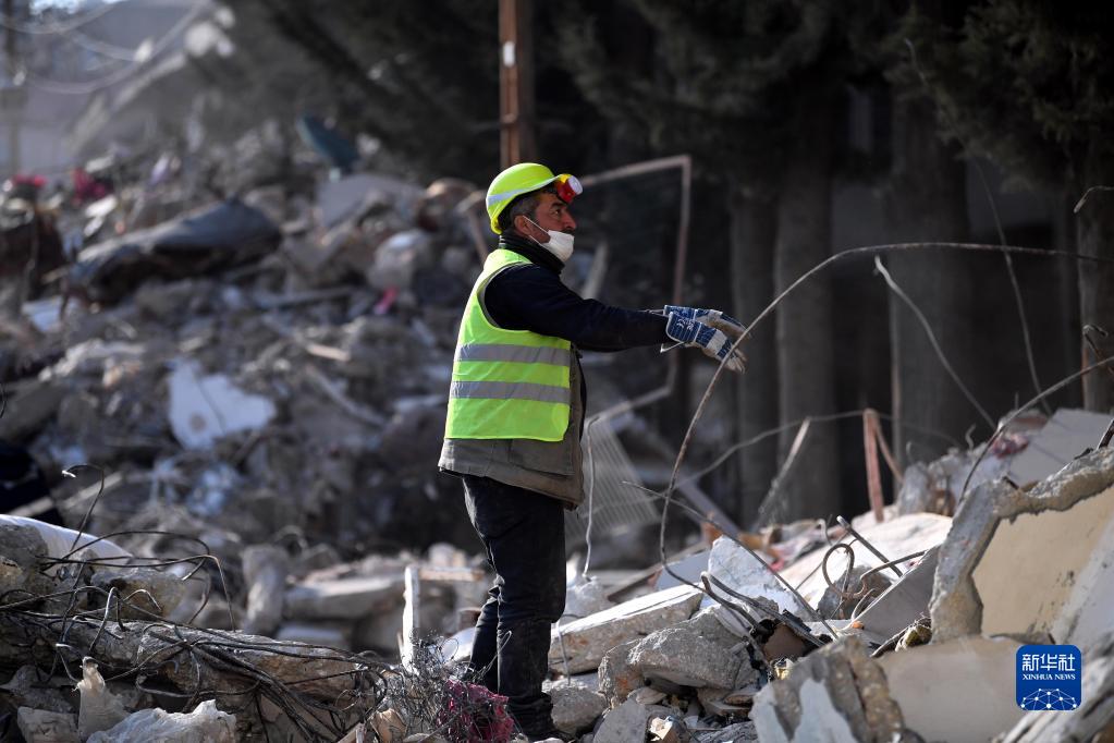 2月12日,一名男子站在土耳其哈塔伊省安塔基亞市一處地震廢墟上。