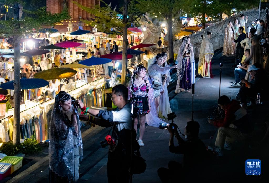 夜幕降臨,位于云南省西雙版納傣族自治州景洪市的告莊西雙景星光夜市流光溢彩,游人如織。富有民族風(fēng)情的旅拍受到游客青睞,成為熱門(mén)體驗項目,拉動(dòng)城市“夜經(jīng)濟”發(fā)展。