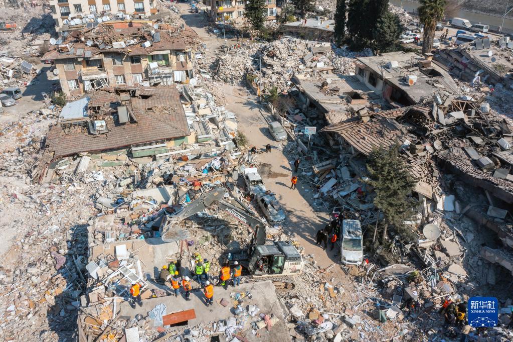 這是2月12日在土耳其哈塔伊省安塔基亞市中心拍攝的地震廢墟(無(wú)人機照片)。