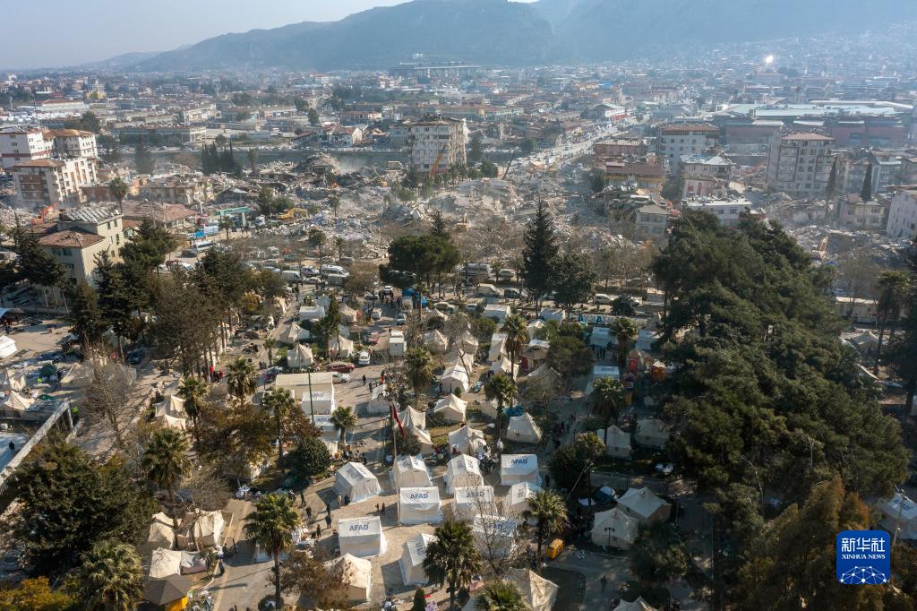 這是2月12日在土耳其哈塔伊省安塔基亞市中心拍攝的地震廢墟和救援帳篷(無(wú)人機照片)。