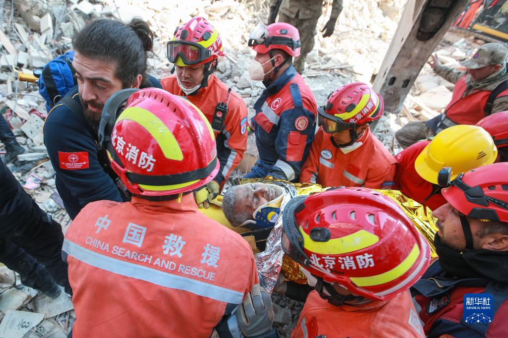 2月12日,在土耳其哈塔伊省安塔基亞市,中土兩國救援隊隊員轉移一名救出的幸存者。