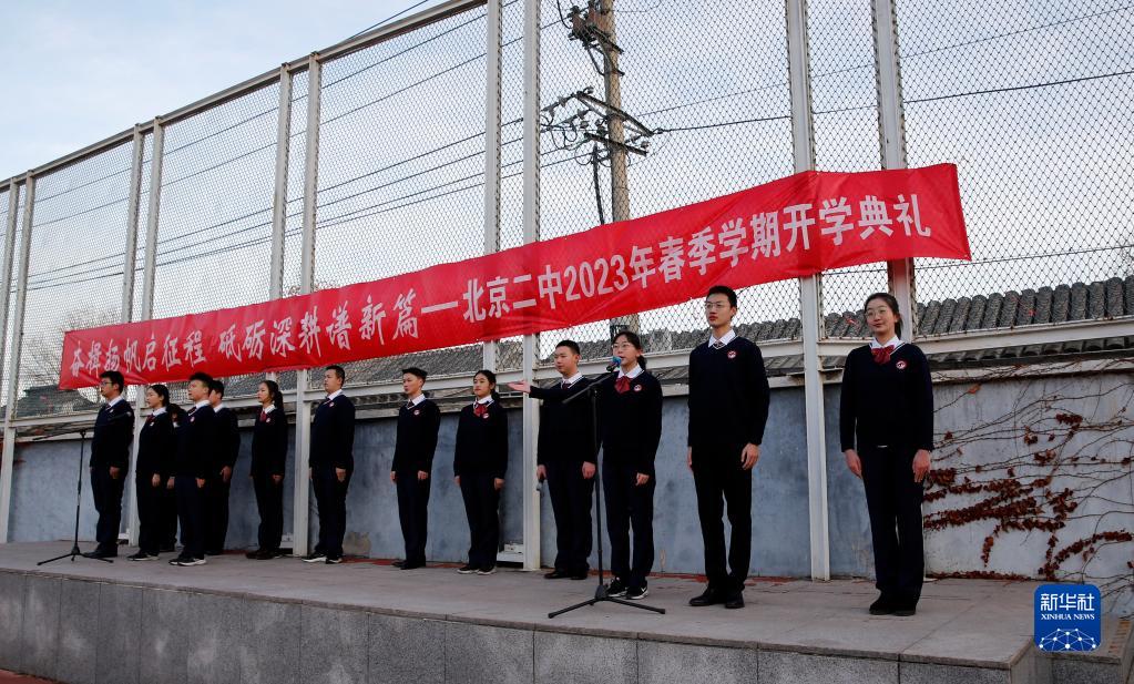 2月13日,北京二中學(xué)生在新學(xué)期開(kāi)學(xué)典禮上表演詩(shī)朗誦。
