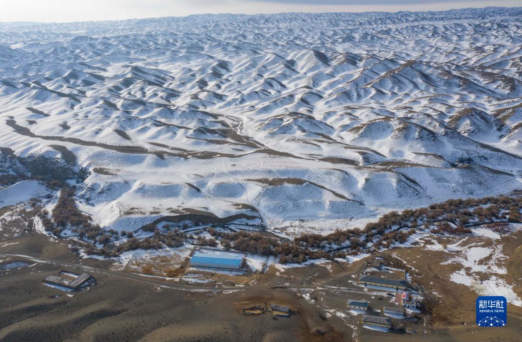 位于新疆巴爾魯克山南坡的裕民縣巴爾魯克牧業(yè)幸福驛站、應急飼草料儲備庫、牧業(yè)醫院(2月12日攝,無(wú)人機照片)。