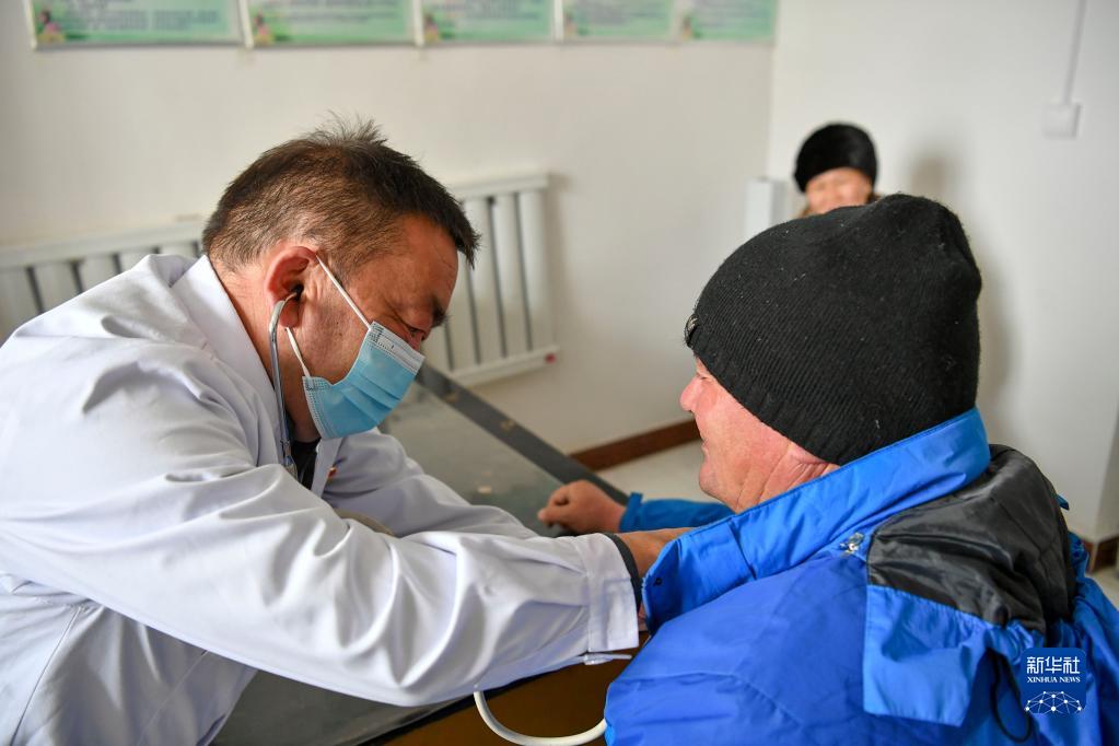 新疆裕民縣牧業(yè)醫院醫生葉爾江·庫坎(左)為牧民檢查身體(2月12日攝)。為方便牧民,牧業(yè)醫院會(huì )定期開(kāi)展上門(mén)巡回診療,送健康上門(mén)。