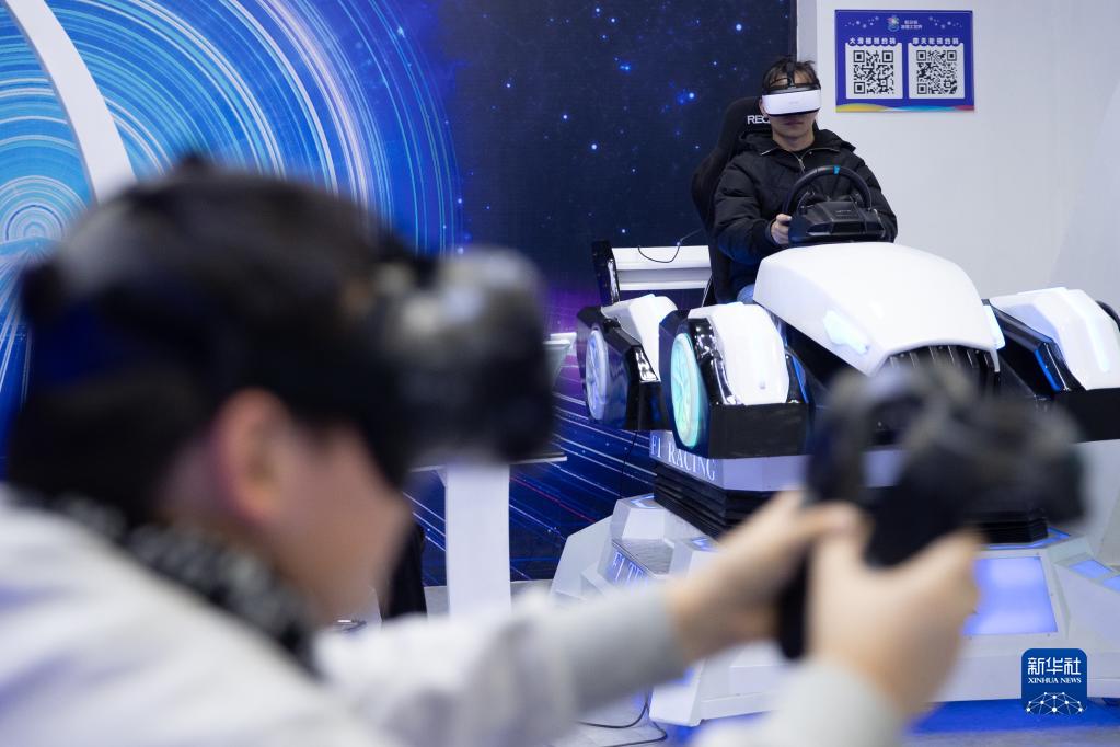 2月12日,游客在冰雪元宇宙體驗中心內游玩。