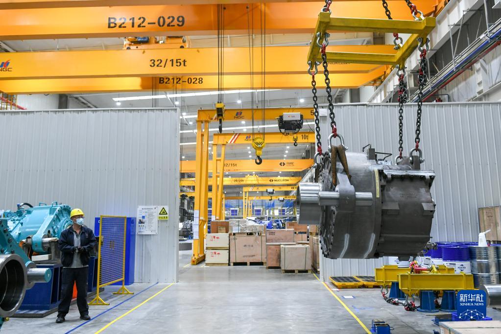 2月13日,工人在南高齒(包頭)傳動(dòng)設備有限公司生產(chǎn)車(chē)間內吊裝零部件。