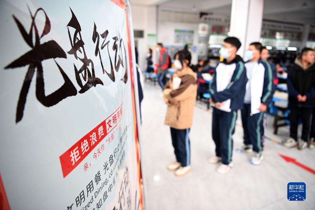 2月13日,寧夏育才中學(xué)學(xué)生在食堂擺放的“光盤(pán)行動(dòng)”公益廣告前排隊。