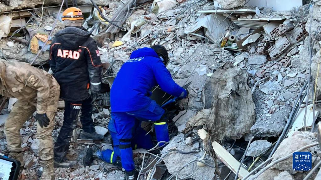 2月13日,在土耳其馬拉蒂亞,中國藍天救援隊隊員與當地救援人員在一處廢墟合作開(kāi)展地震救援工作。