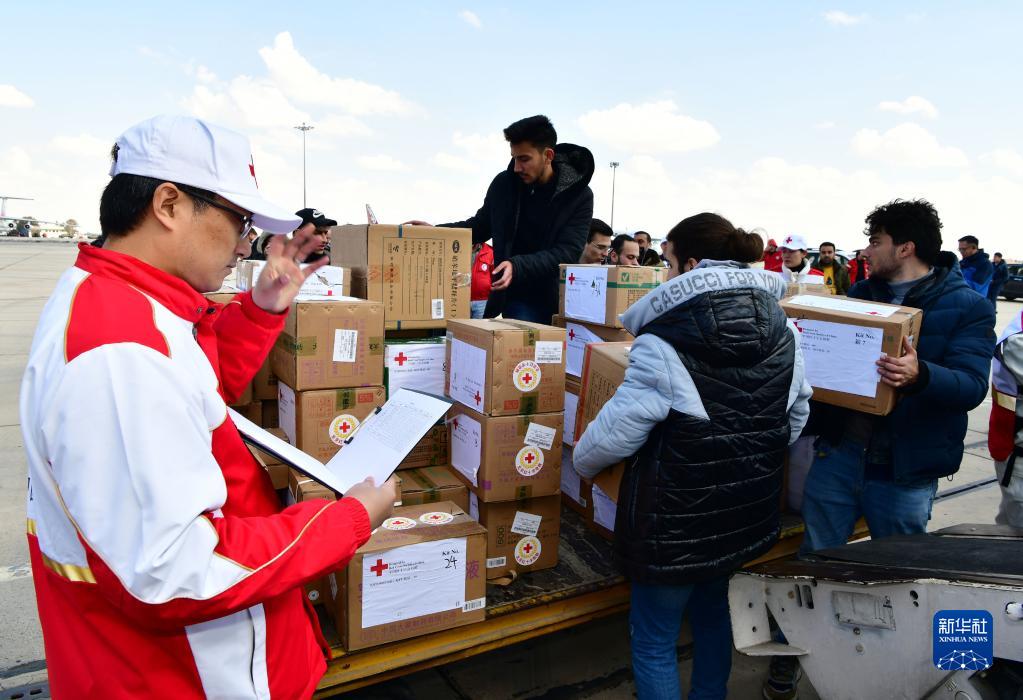 2月13日,工作人員在敘利亞大馬士革國際機場(chǎng)卸載中國紅十字會(huì )援助的人道主義物資。