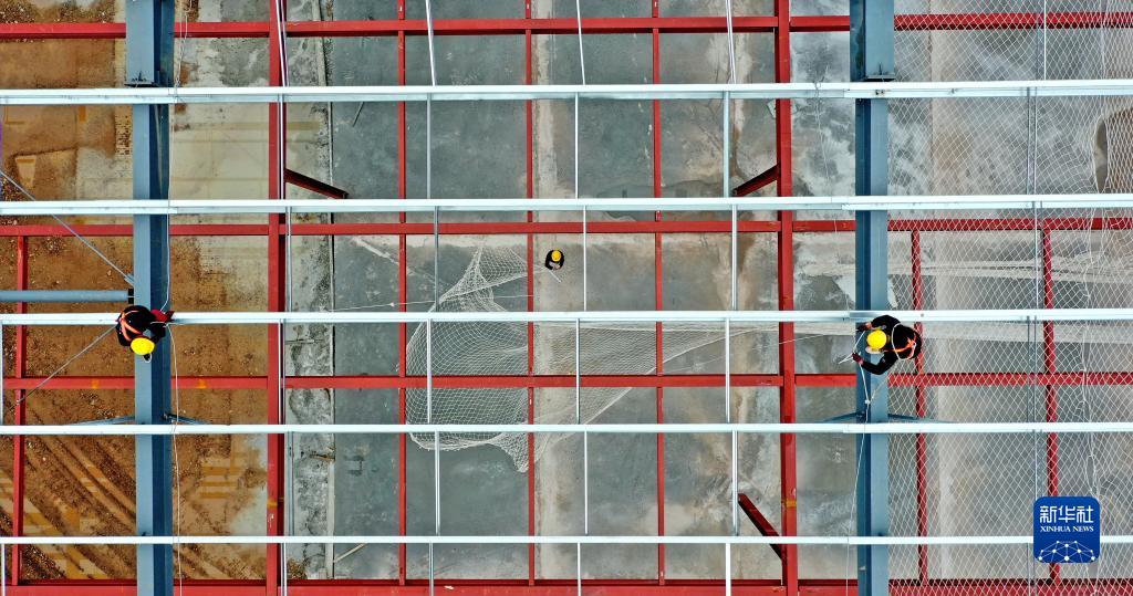 2月14日,在浙江省臺州市仙居縣下各鎮的比亞迪新能源刀片電池項目建設現場(chǎng),施工人員加緊標準化廠(chǎng)房和配套設施建設(無(wú)人機照片)。