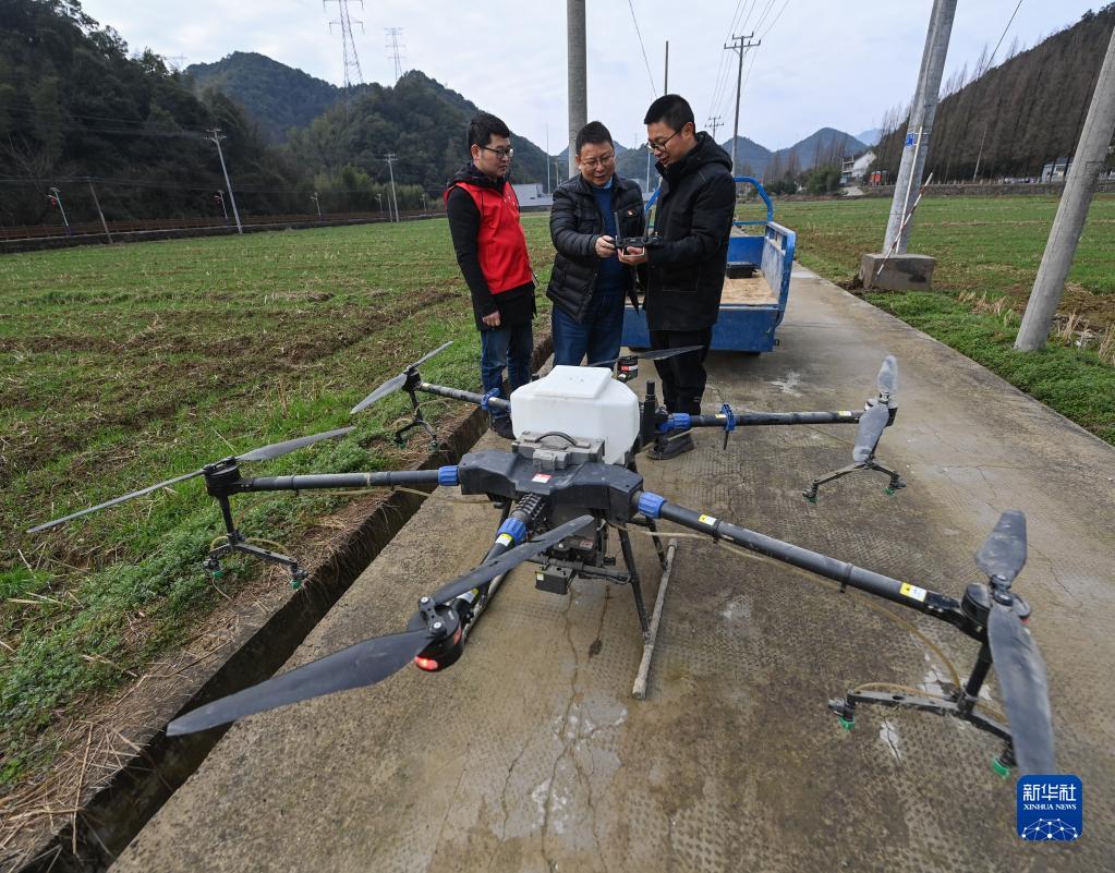 2月14日,在杭州市臨安區板橋鎮的稻田內,農技專(zhuān)家俞?。ㄖ校┡c返鄉創(chuàng )業(yè)青年包洪軍(右)探討農用無(wú)人機的具體應用。包洪軍大學(xué)畢業(yè)后回鄉承包了1000多畝農田,使用完善的機械作業(yè)、無(wú)人機植保等現代農業(yè)技術(shù),打造現代化糧倉。