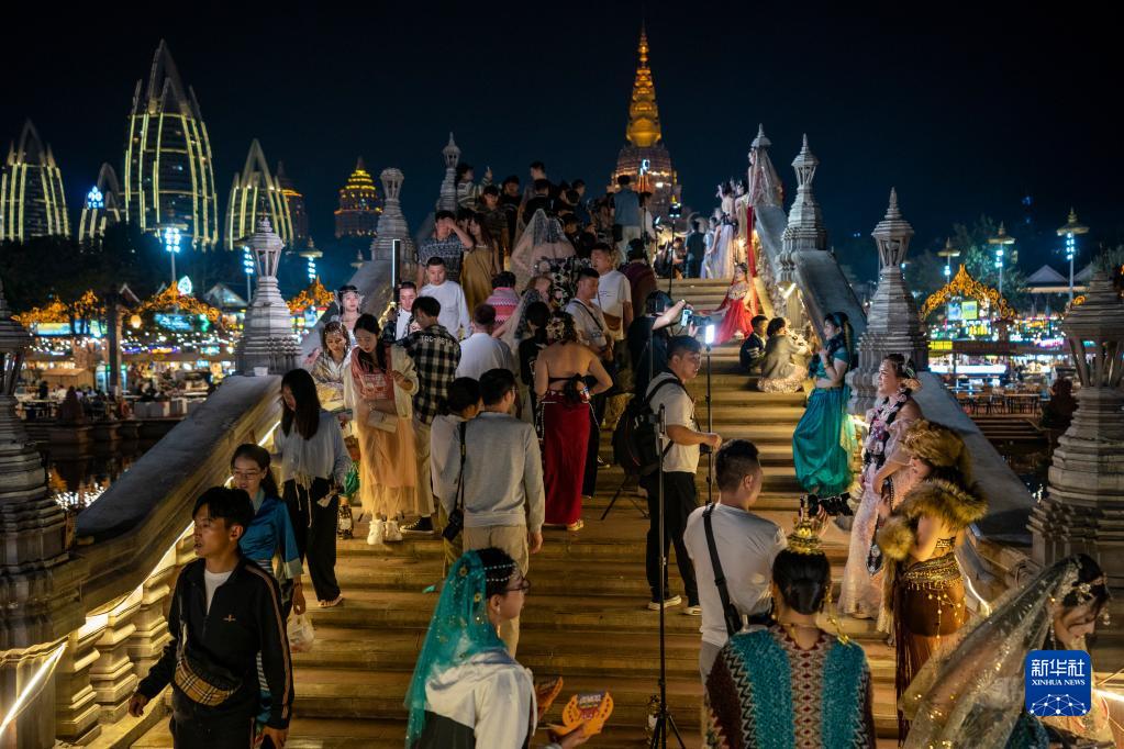 2月13日,游客在西雙版納州景洪市告莊西雙景星光夜市游覽、拍照。