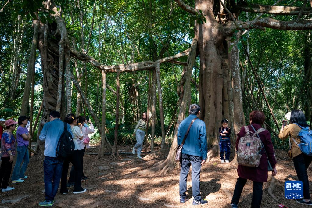2月12日,游客在位于西雙版納州勐臘縣勐侖鎮的中國科學(xué)院西雙版納熱帶植物園內“獨樹(shù)成林”景點(diǎn)拍照留念。