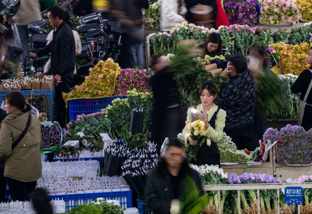 主播畢茜茜在斗南花卉交易市場(chǎng)直播(2月13日攝)。