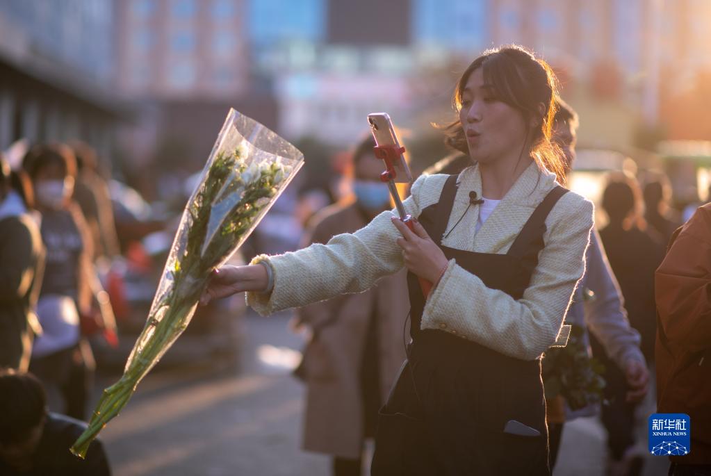 主播畢茜茜在斗南花卉交易市場(chǎng)為顧客介紹鮮切花(2月13日攝)。