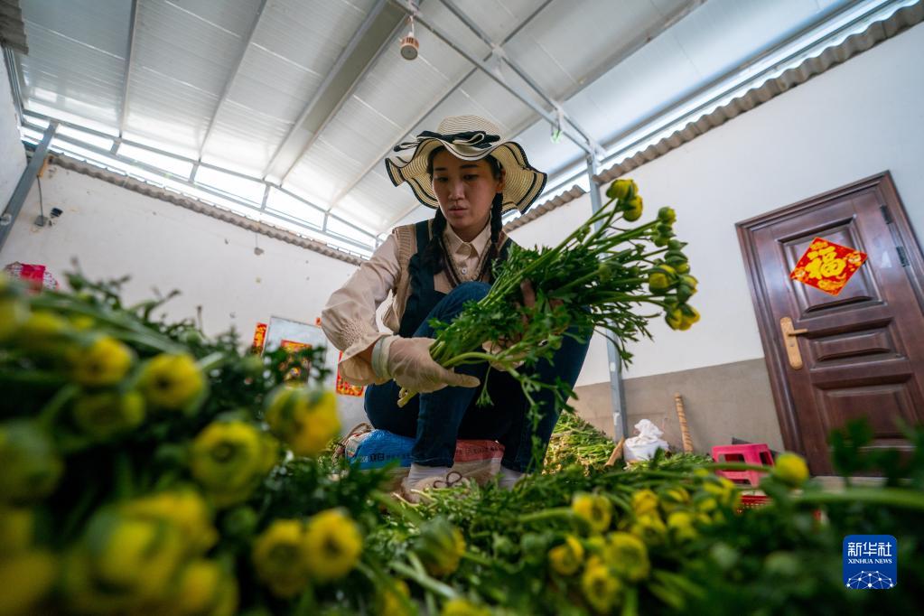 主播畢茜茜在分揀剛采摘的鮮花(2月12日攝)。