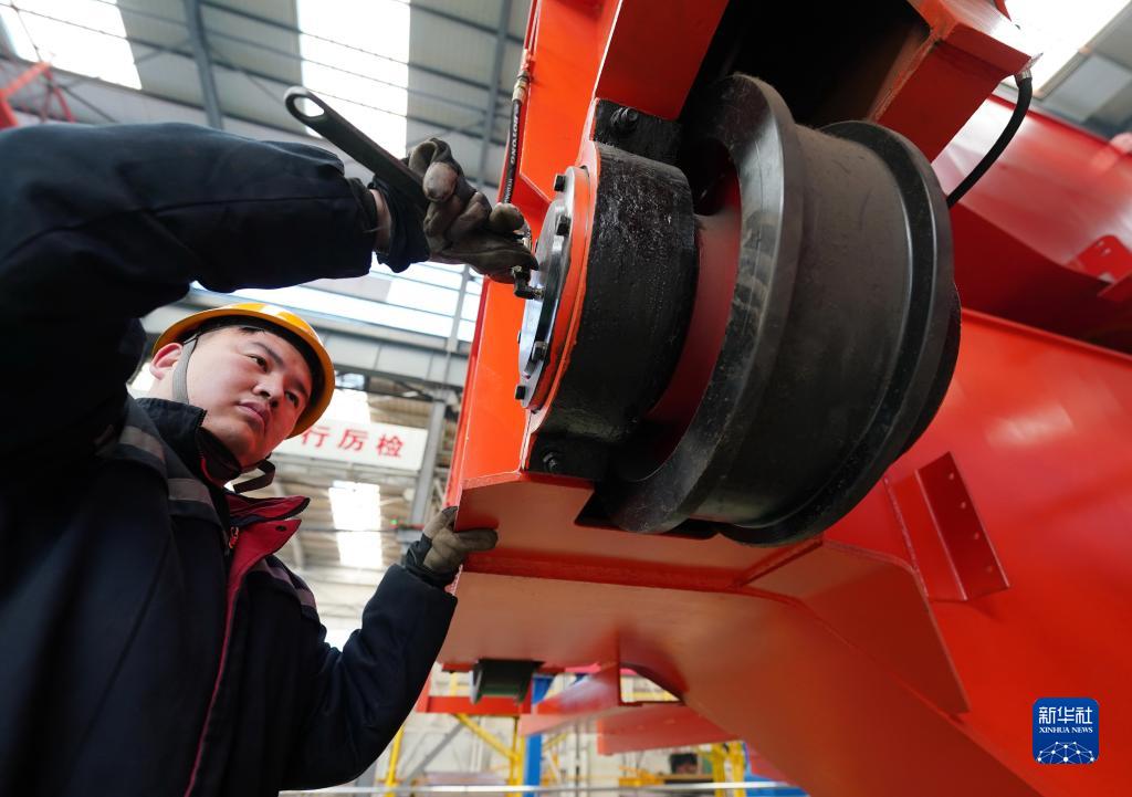 2月14日,工人在唐山市豐潤區一家起重設備制造企業(yè)的生產(chǎn)車(chē)間工作。