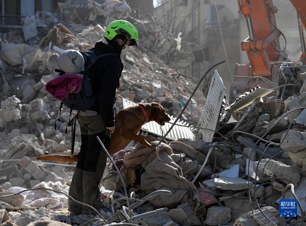 2月14日,在土耳其哈塔伊省安塔基亞市,一名女子帶著(zhù)狗在地震廢墟中搜尋。