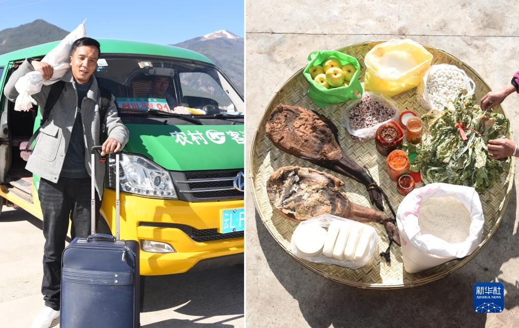 拼版照片:左圖為云南省大理白族自治州劍川縣馬登鎮文屏村人張茂盛扛著(zhù)火腿、扶著(zhù)行李箱在農村客運車(chē)前留影,準備前往云南省麗江市創(chuàng )業(yè)(1月26日攝)。這是張茂盛外出務(wù)工的第10年,他一直在云南迪慶、麗江兩地從事建筑行業(yè),期間還創(chuàng )業(yè)開(kāi)過(guò)燒烤店和小食店。右圖為張茂盛即將裝進(jìn)行囊里的物品(1月26日攝),有父母親手制作的火腿,當地特產(chǎn)餌塊和豬肝胙、豆豉和白蕓豆等。