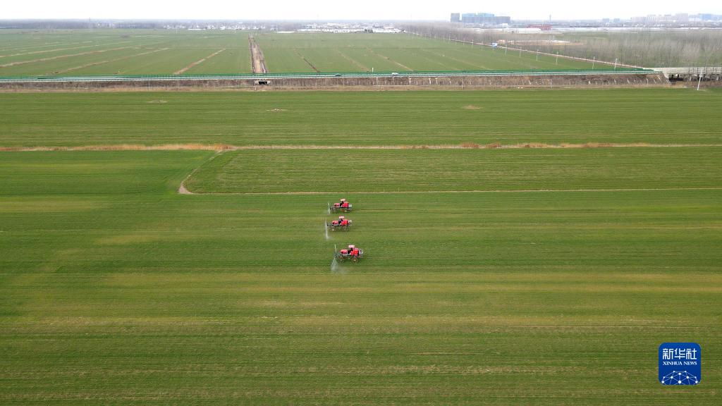 2月14日,在安徽省蚌埠市五河縣頭鋪鎮,農民駕駛農機給小麥噴灑農藥(無(wú)人機照片)。