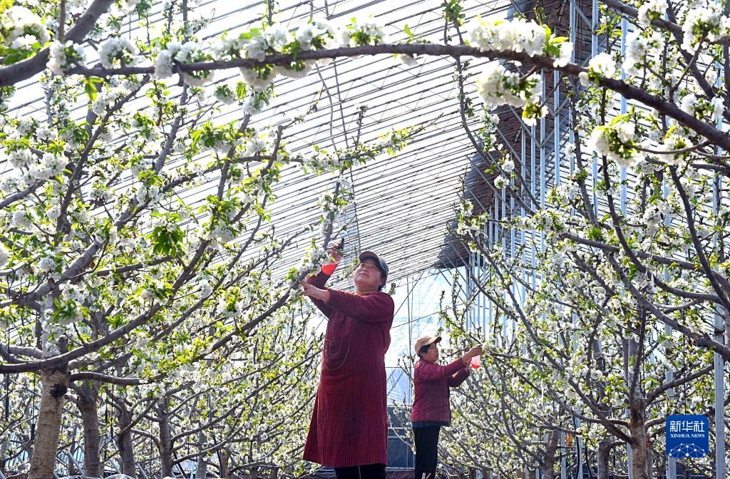 2月14日,在山東省淄博市沂源縣燕崖鎮燕崖村一大棚櫻桃種植園區,“產(chǎn)業(yè)工人”為櫻桃花授粉。